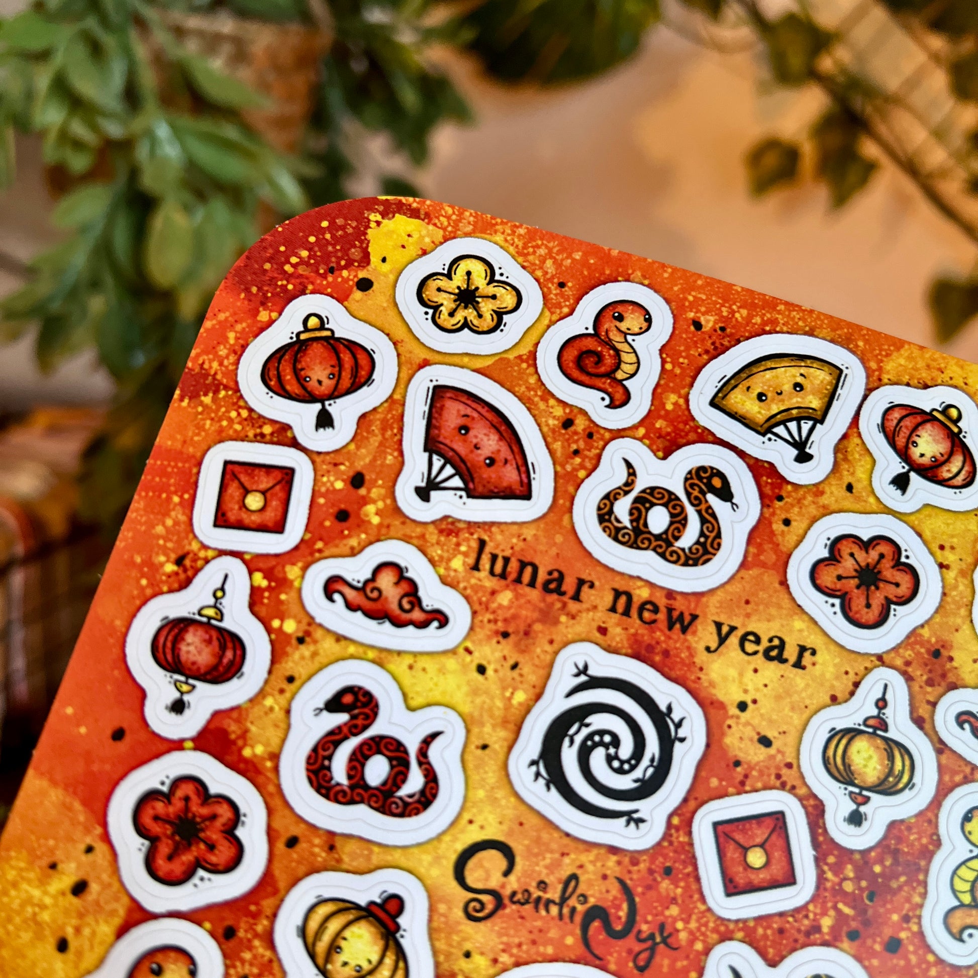A Lunar New Year sticker sheet on buttery soft matte white sticker paper with different sized festive decorations and snakes! Great for planners, journals and decorating notebooks!