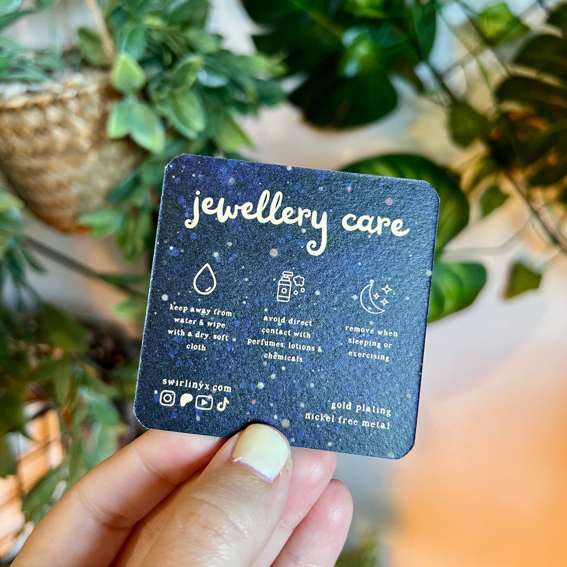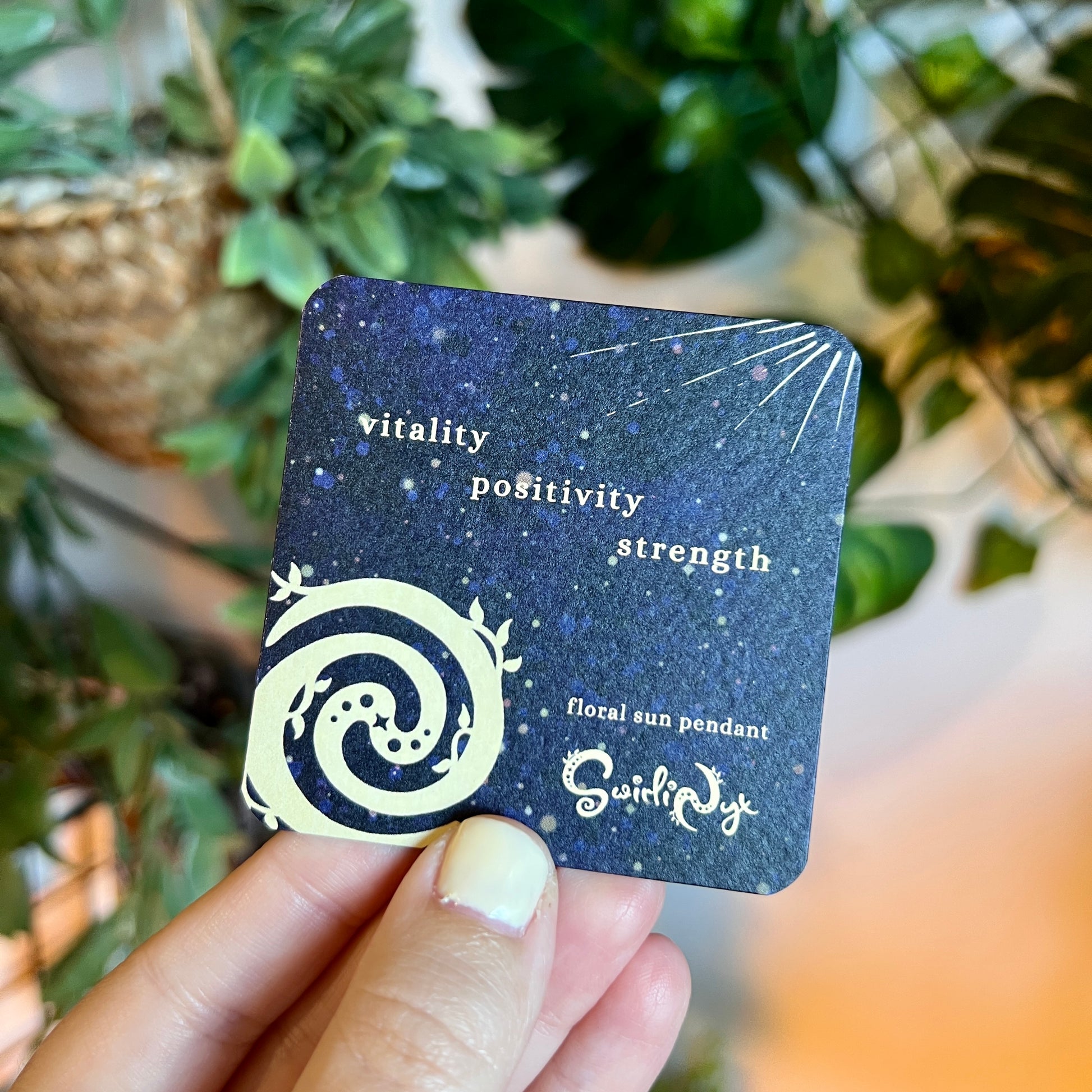 Comes with a luxury textured care card featuring the necklace's meaning, symbolism and care instructions on a beautiful celestial backdrop and a soft fabric SwirliNyx embossed pouch and insert.