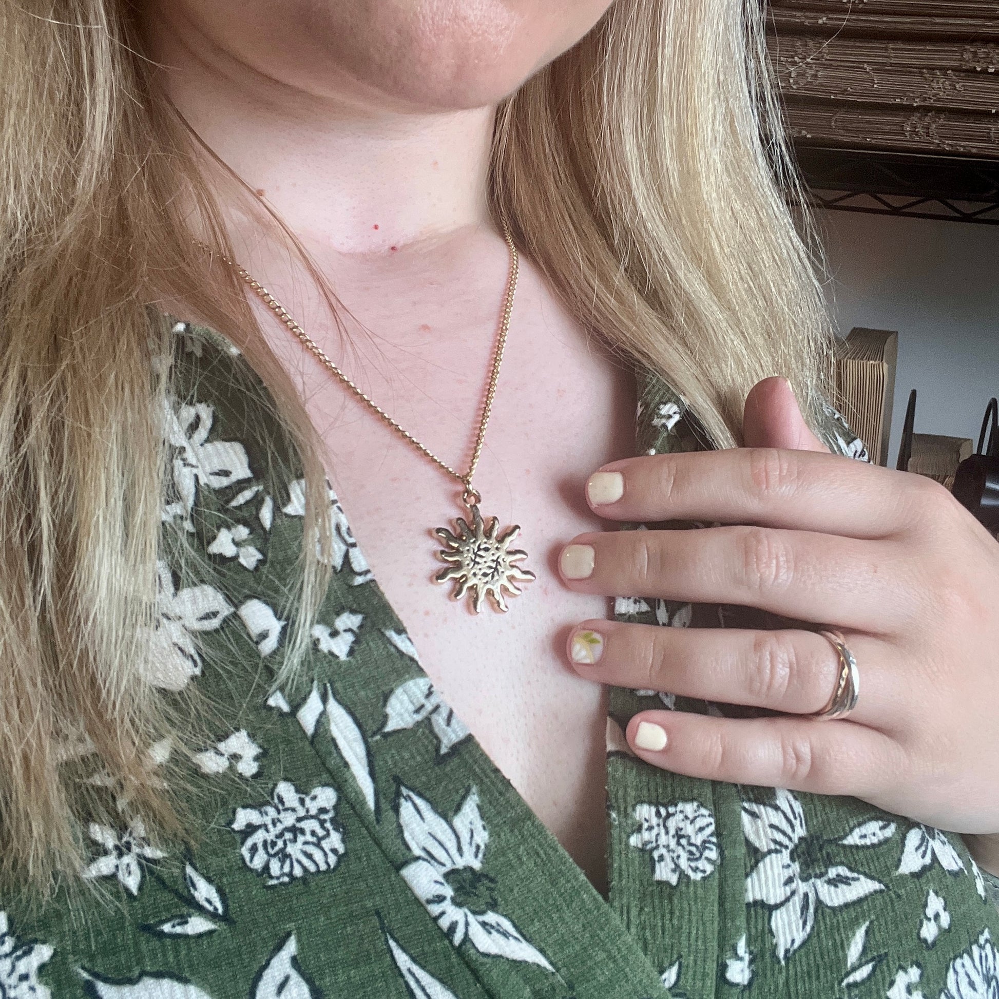 A beautiful shiny golden sun necklace with tiny black foliage details symbolising the sun meanings of vitality, positivity and strength.