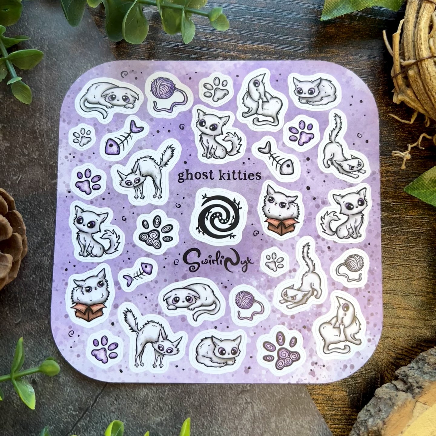 A cute white cat sticker sheet on buttery soft matte white sticker paper with extra paw prints, fish bones and balls of string! Great for planners, cases and decorating notebooks! Grab more colours in the shop including Void Kitties and Galaxy Kitties!