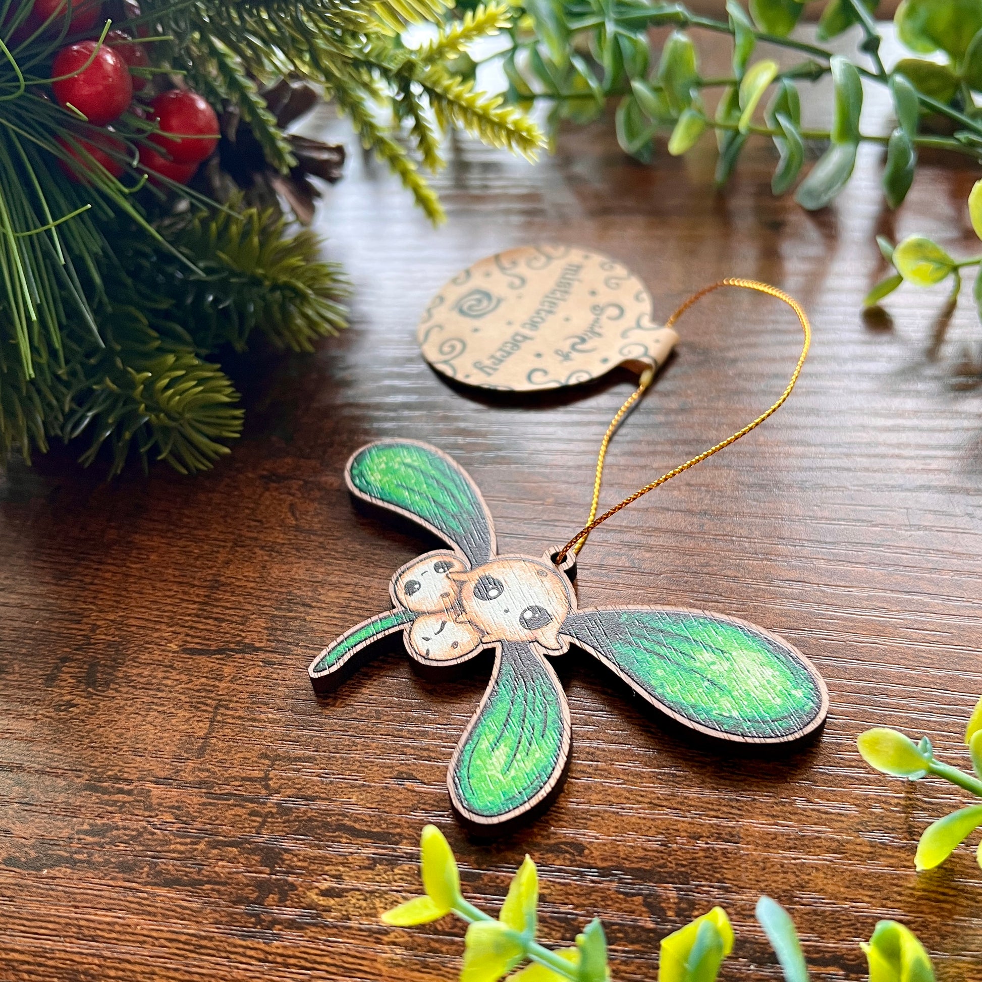 Cute and sweet mistletoe berry characters on a simple walnut wood. A beautiful wooden ornament to add to your tree or home for the festive season. With a vibrant matte finish, walnut veneer and gold thread for hanging.