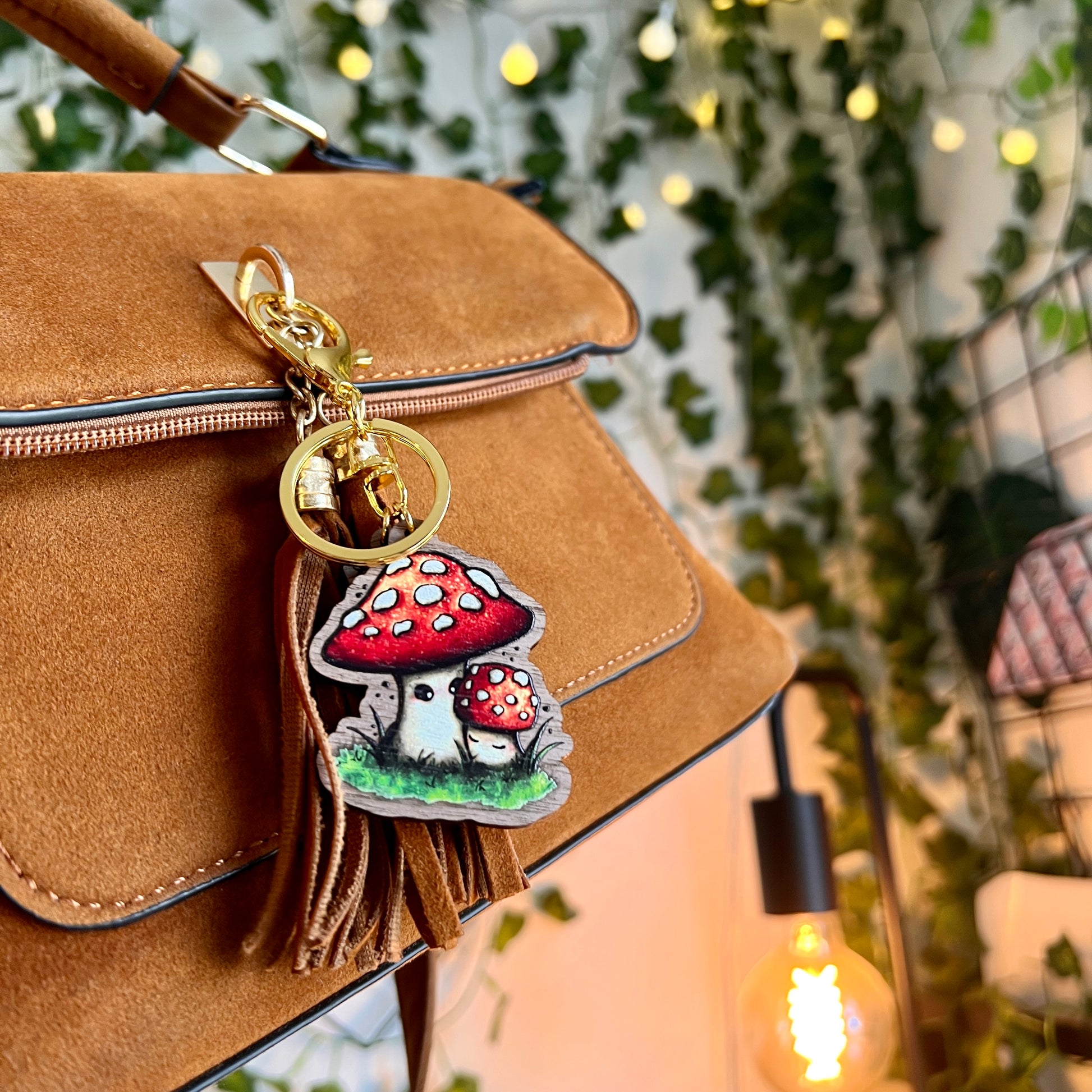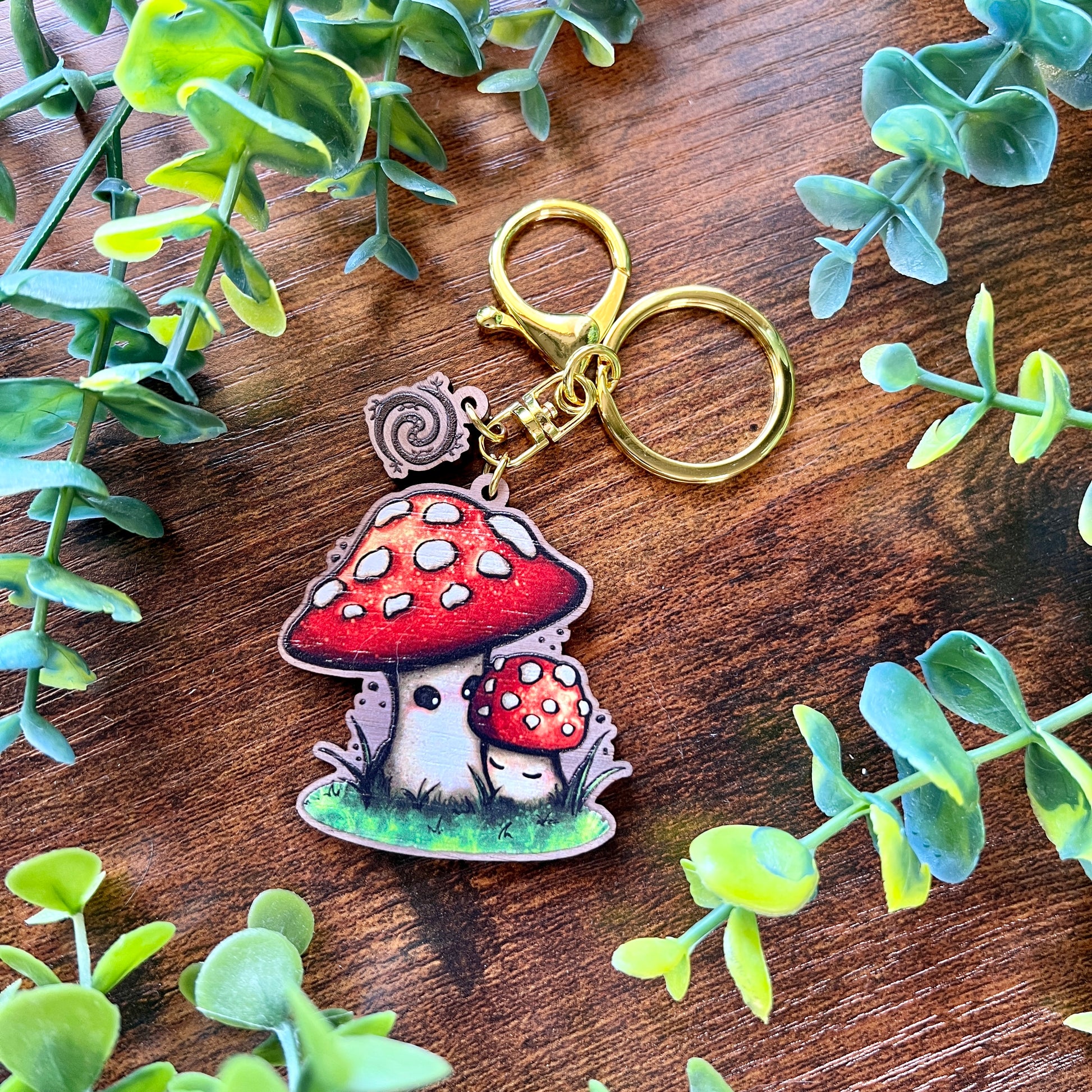 'Mushie Mama' - A mama mushroom receiving a little hug from her baby mushroom. A beautiful wooden accessory to add to your bag or keys, with a vibrant matte finish, walnut veneer and gold metal keychain. Comes with a small SwirliNyx wooden logo.