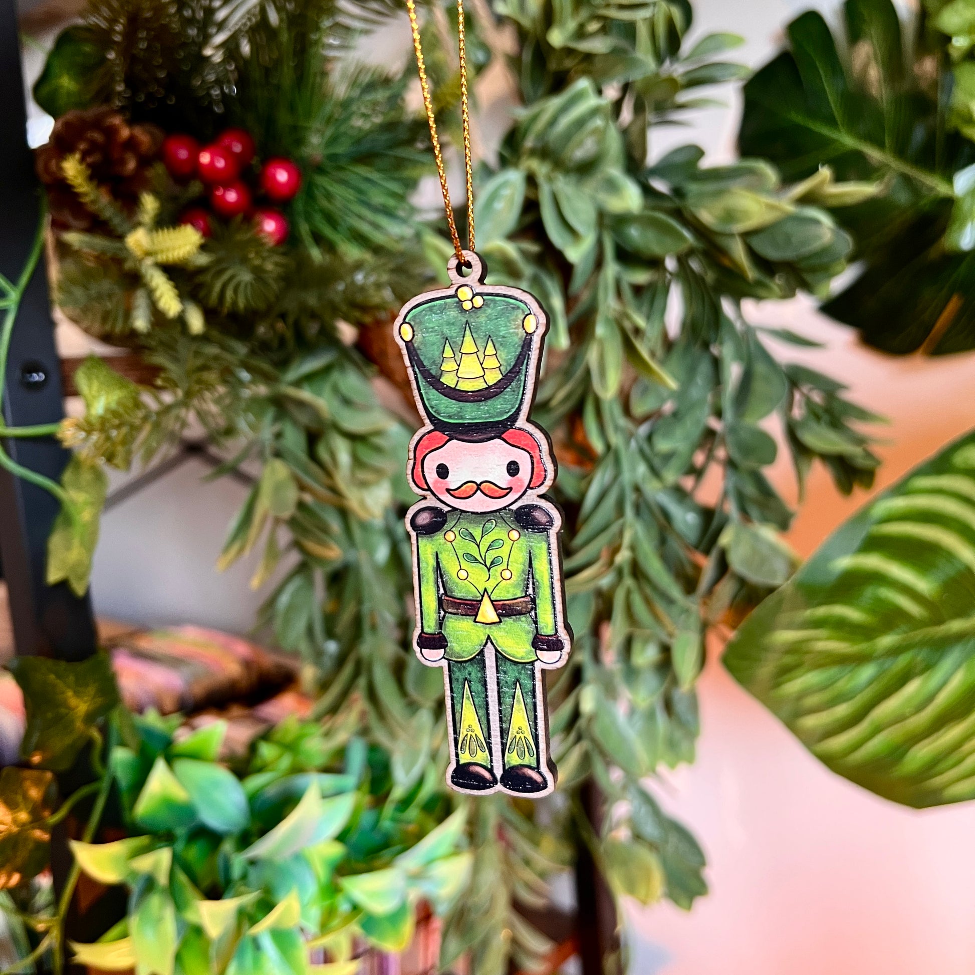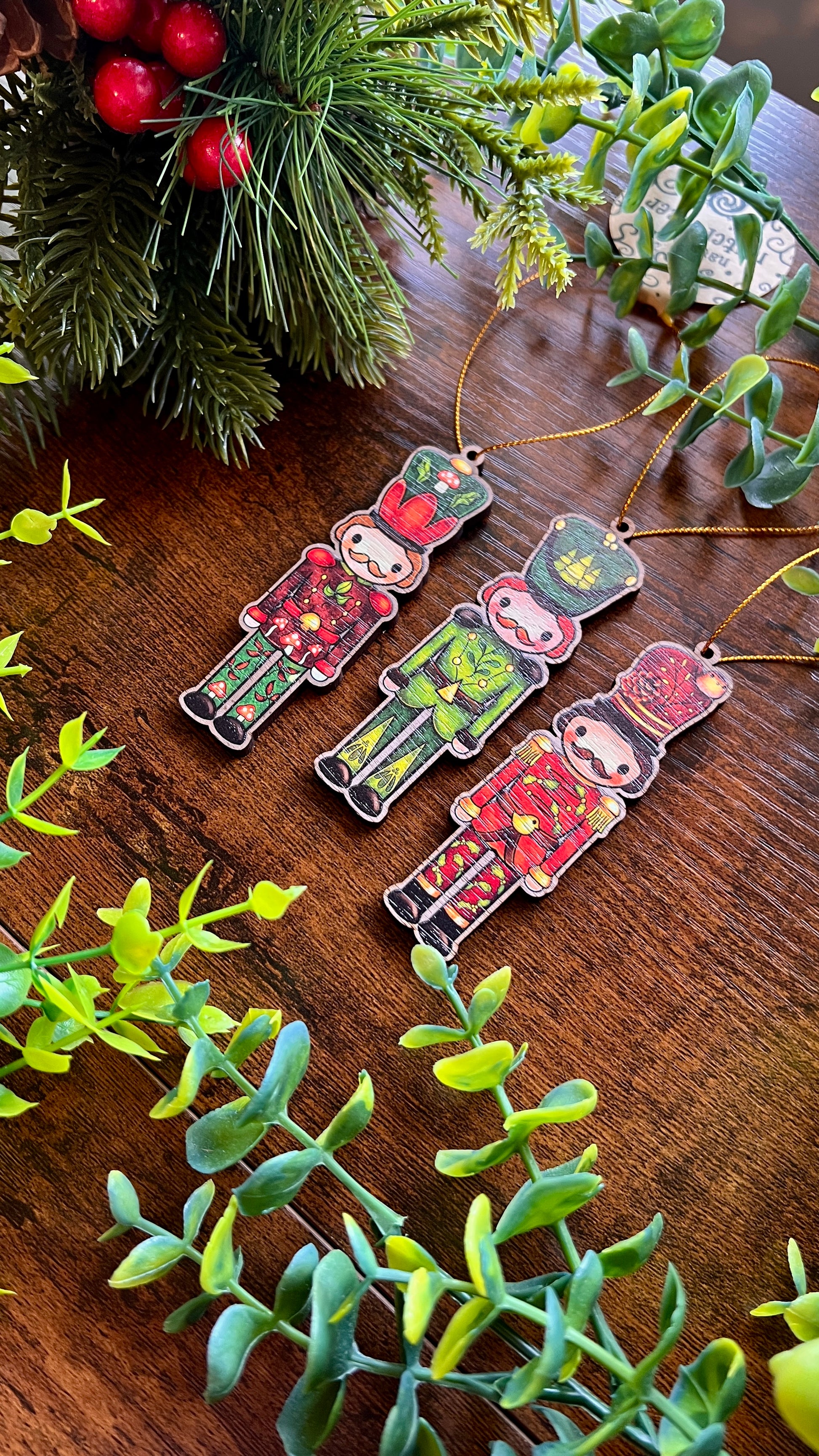 Adorable nutcrackers themed to nature's colour palette on a simple walnut wood. A set of three beautiful wooden ornaments to add to your tree or home for the festive season. With a vibrant matte finish, walnut veneer and gold thread for hanging.