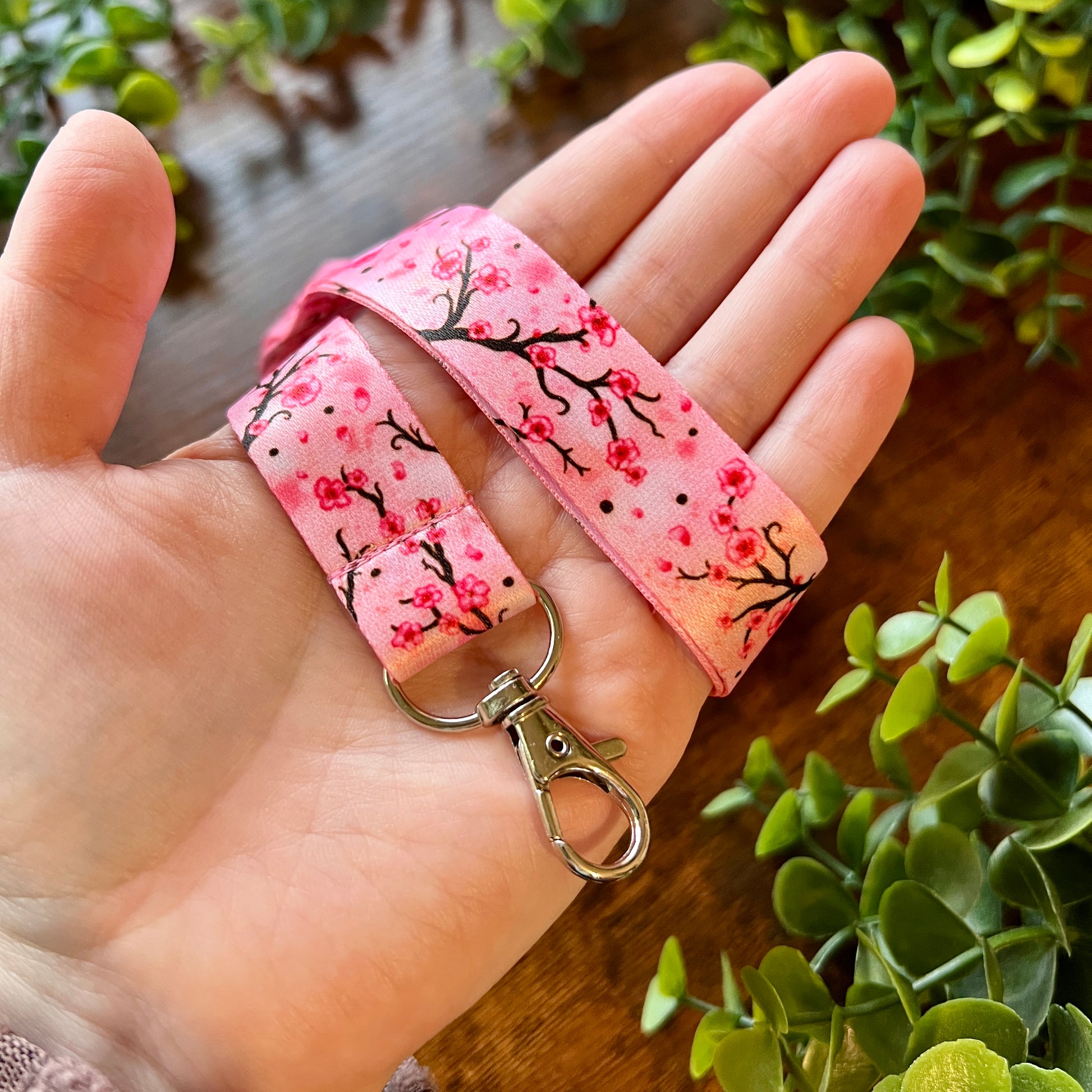 A pink sakura pattern on an pastel pink backdrop. A beautiful accessory to add a little colour for your workplace/keys or as a gift!