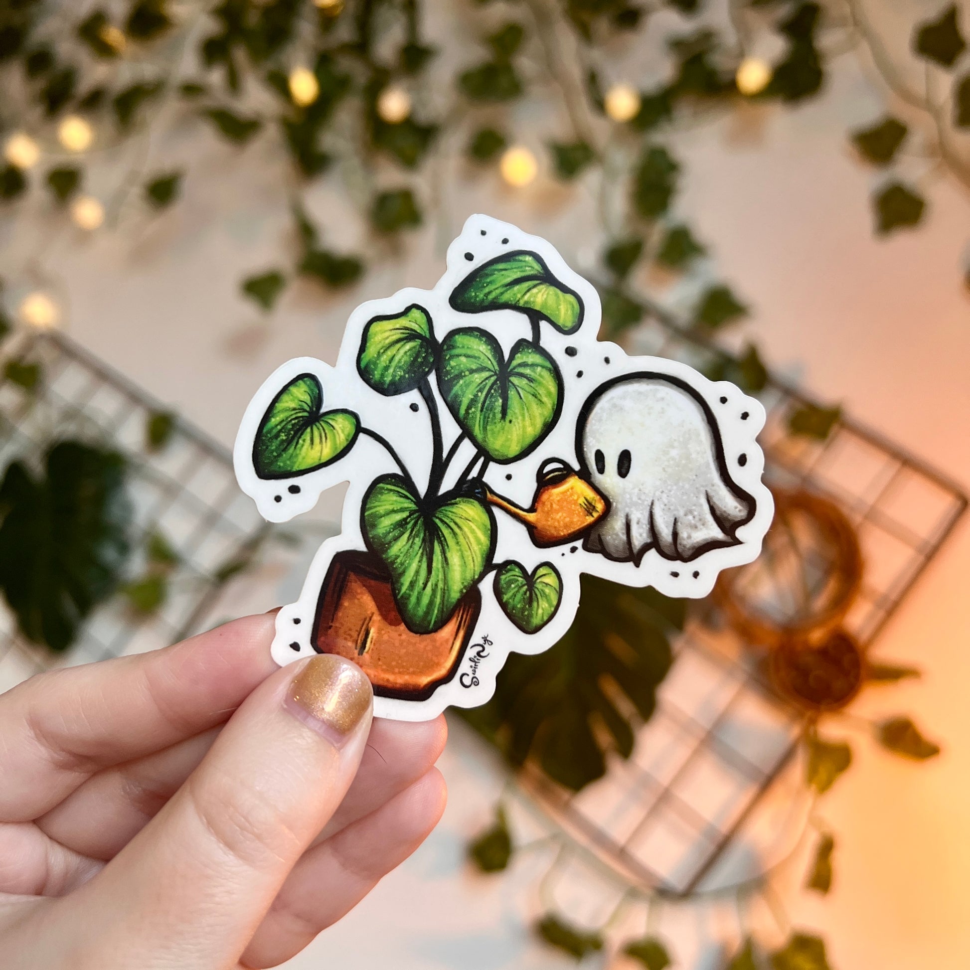 'Plant Ghost' - A little pearly white ghost carefully caring for his house plant. This die cut sticker is printed on high quality transparent sticker vinyl!